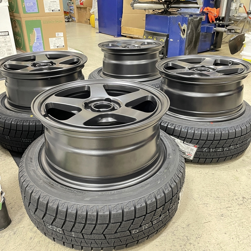 オーナー様ご希望の「ブラックカラー」のホイール設定は少なく、サイズ的に流用可能な国産車用ホイールでお選びいただきました。