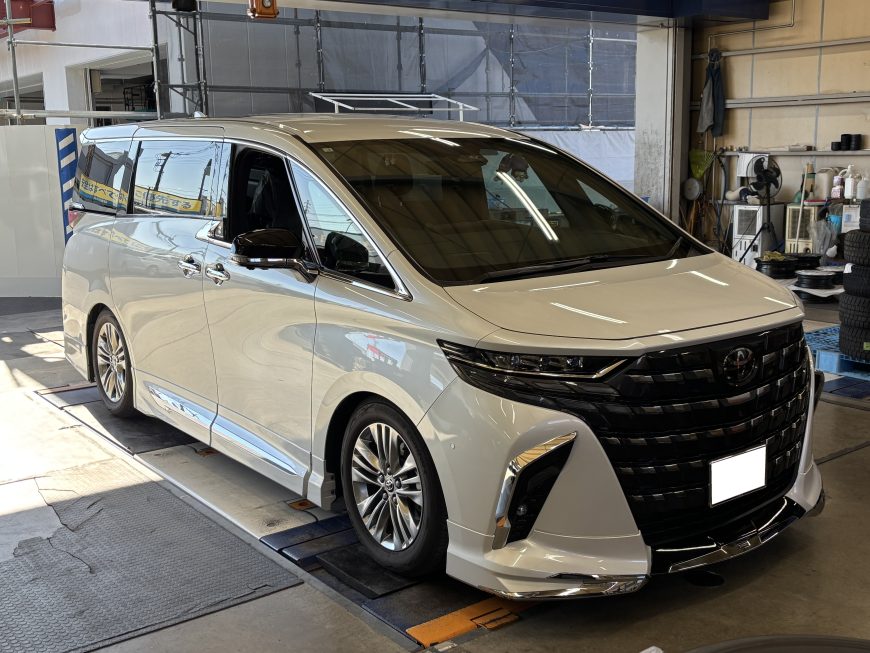 まだ旧店舗のときのピットに入庫した40系アルファード、パーフェクトダンパーで車高はペタッと下がり、NEWホイールの受け入れ準備はOK。